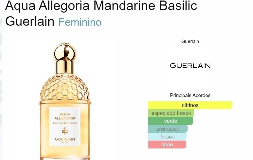 Aqua Allegoria Mandarine Basilic de Guerlain é um perfume Cítrico Aromático Feminino. Aqua Allegoria Mandarine Basilic foi lançada em 2007. O perfumista que assina esta fragrância é Marie Salamagne. As notas de topo são: Clementina, Laranja Amarga, Flor de Laranjeira, Chá Verde e Hera. As notas de coração são: Mandarina, Manjericão, Camomila e Peônia. As notas de fundo são: Sândalo e Âmbar.