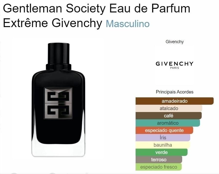 Gentleman Society Eau de Parfum Extrême de Givenchy é um perfume Masculino. Esta é uma nova fragrância. Gentleman Society Eau de Parfum Extrême foi lançada em 2024. O perfumista que assina esta fragrância é Karine Dubreuil-Sereni. As notas de topo são: Noz-moscada, Hortelã Picante e Sálvia Esclaréia. As notas de coração são: Café, Raíz de Orris, Narciso francês, Vetiver de Madagascar, Vetiver do Haiti e Vetiver. As notas de fundo são: Baunilha de Madagascar, Sândalo Australiano e Cedro do Himalaia.